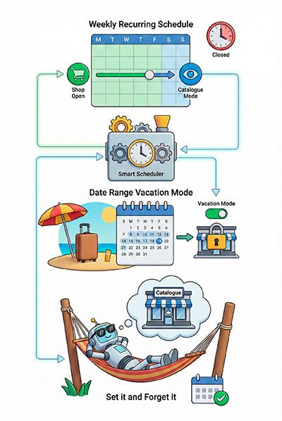 Take the manual work out of managing your store’s availability. With the advanced scheduler, you can automate your shop’s transition between Catalogue and Shop mode based on time and date.