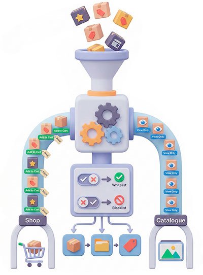 Maintain total precision over which parts of your inventory are affected by Catalogue Mode. The Pro version offers a powerful filtering system to handle complex shop requirements.